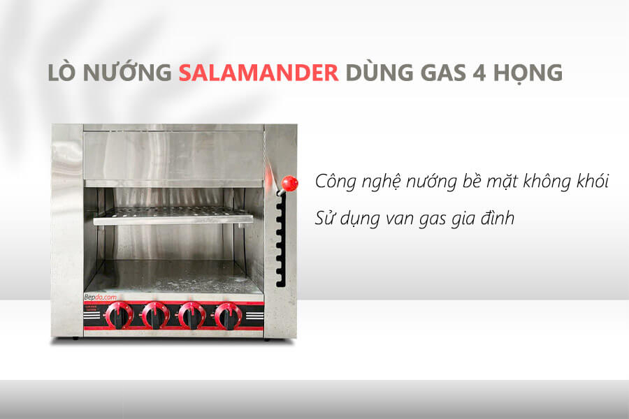 Nếu bạn đang kinh doanh nhà hàng, quán steak, quán bánh mì hoặc các món nướng thì lò nướng Salamander 4 họng gas là thiết bị rất đáng đầu tư. Đây là dòng lò nướng chuyên dùng để nướng bề mặt thực phẩm giúp món ăn vàng giòn, thơm ngon và đẹp mắt hơn khi phục vụ khách.