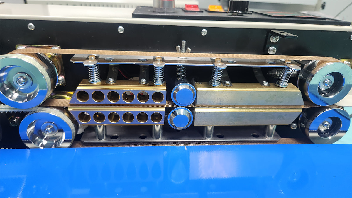 Máy được trang bị băng tải giúp đưa túi đi qua bộ phận hàn một cách tự động.