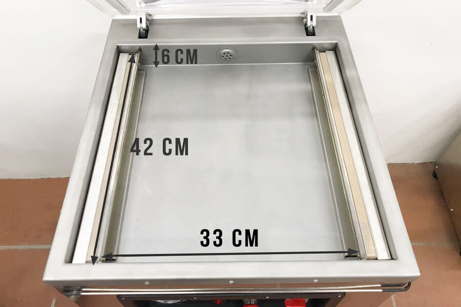 Máy được trang bị buồng hút chân không có kích thước rộng giúp đóng gói nhiều sản phẩm cùng lúc, tăng hiệu quả làm việc cho các cơ sở chế biến.