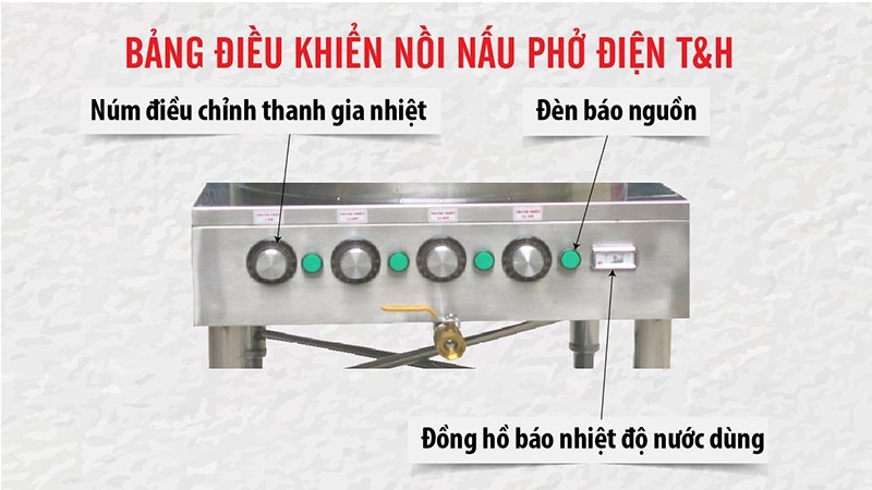 Nồi nấu phở điện 100L được trang bị bảng điều khiển đơn giản với núm điều chỉnh công suất và đèn báo hoạt động.